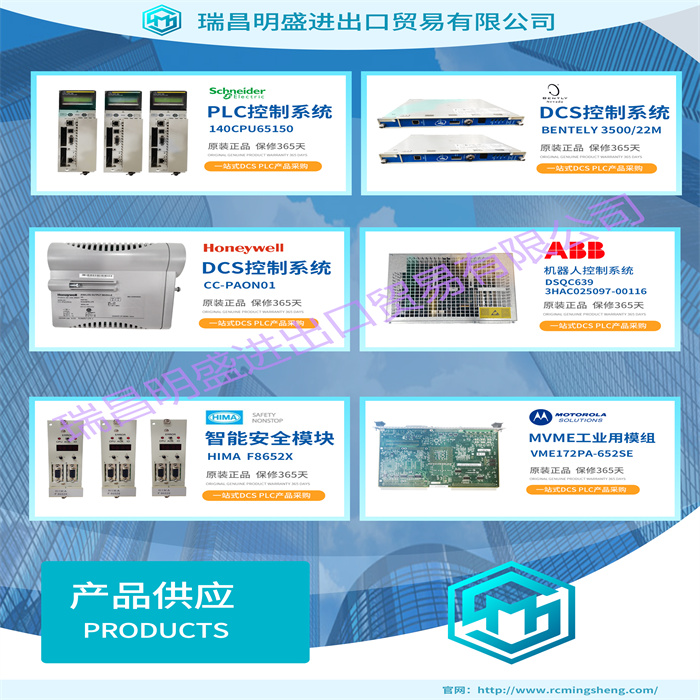 主营品牌包括 ABB贝利、GE/FUANC、FOXBORO、英维思TRICONEX 、本特利BENTLY、A-B罗克韦尔、艾默生EMERSON 、OVATION、MOTOROLA、XYVOM、霍尼韦尔HONEYWELL 、力士乐REXROTH、KUKA、NI、DEIF、横河、伍德沃德WOODWARD、瑞恩、施耐德SCHNEIDER 、安川、 穆格MOOG、PROSOFT等品牌。